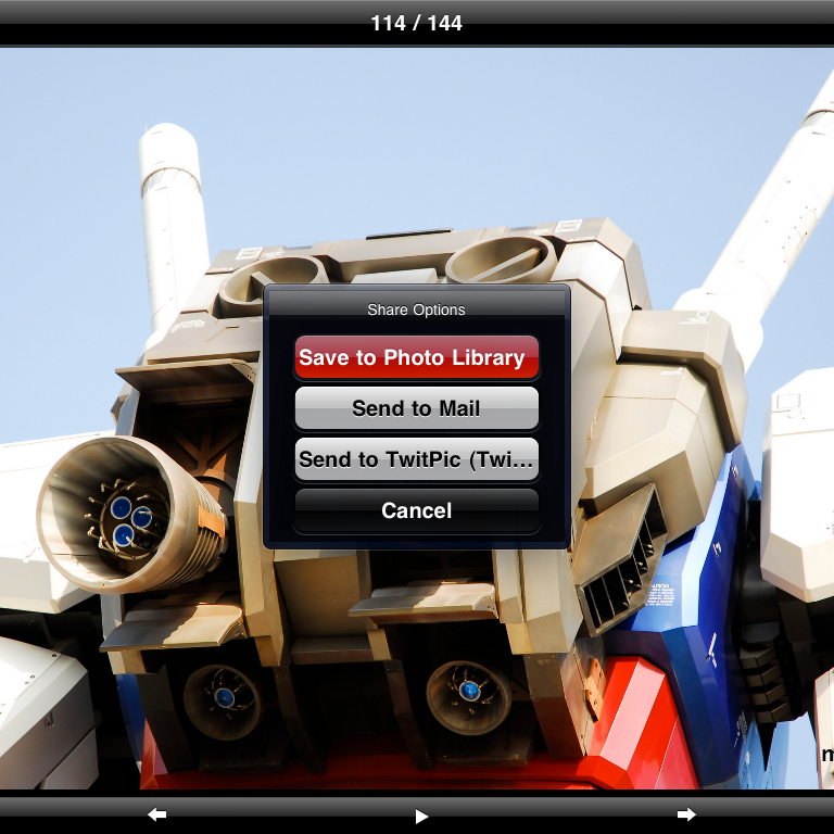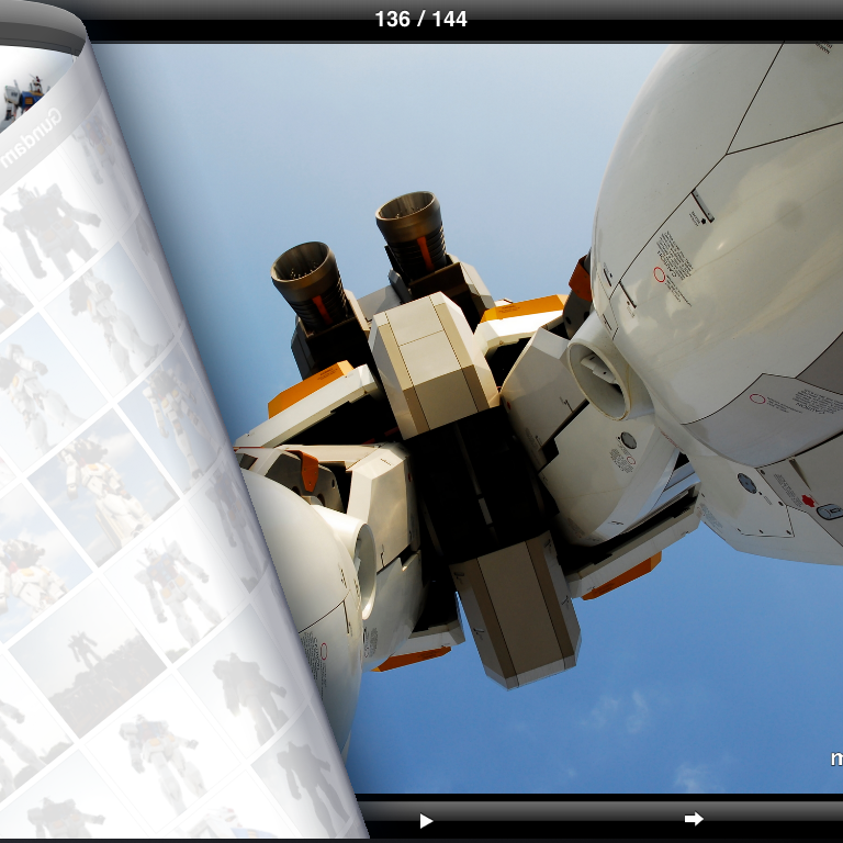 → 2nd Effect: Photos fall down from top to bottom depending upon the Ipad direction by the gravity sensor. - Zoon In/Out mode: Enlarge the specific spot to check in detail.