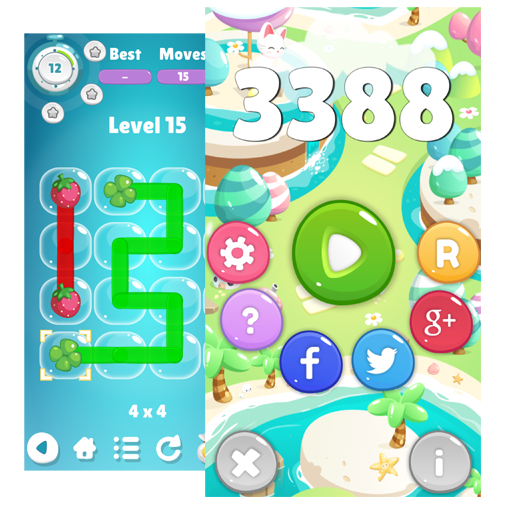 3388은 전체 보드를 전부 채우면서 같은 그림을 서로 연결하면 클리어되는 간단한 퍼즐게임입니다.