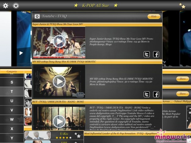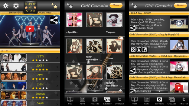 K-POP All Star는 실시간으로 각 그룹별 또는 가수별 정보를 수집해 보기 쉽게 구성해 주는 어플리케이션으로 약 200개가 넘는 섹션에는 K-POP 그룹, 밴드, 가수들의 상세정보와 뮤직비디오, 최신뉴스 그리고 팬들이 올린 사진 및 트위터 정보 등을 간편하게 확인가능합니다. 앱스토어에서 바로 다운로드 가능합니다. K-POP All Star에 관한 더 자세한 사항은 아래 링크를 참조하세요. :: K-POP All Star ::